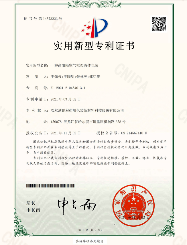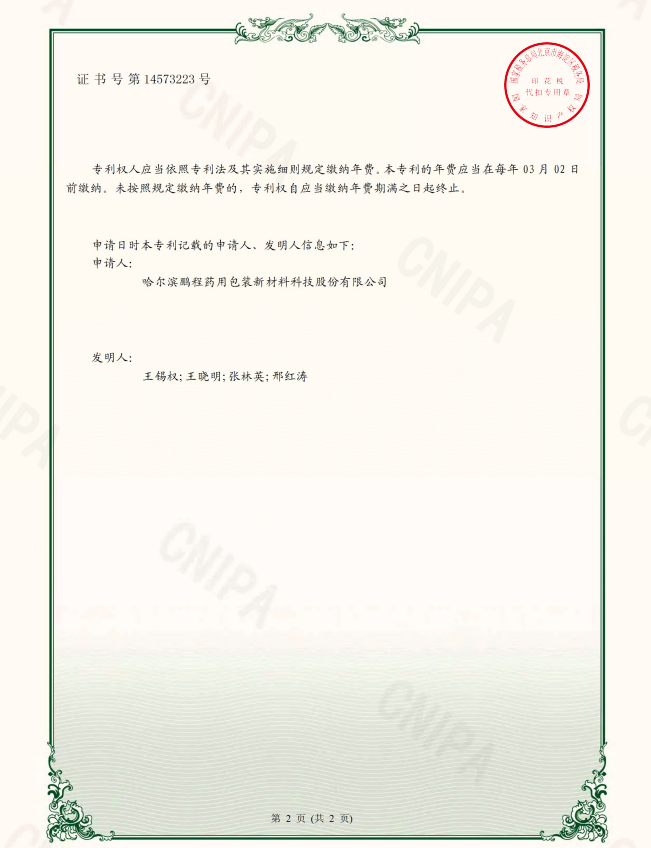 專利 權(quán) 人:哈爾濱鵬程藥用包裝新材料科技股份有限公司
