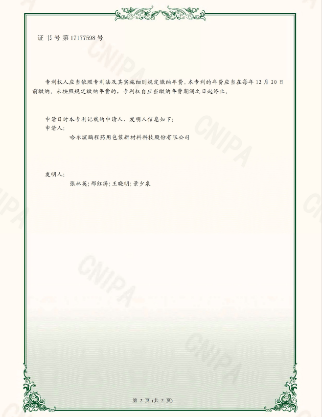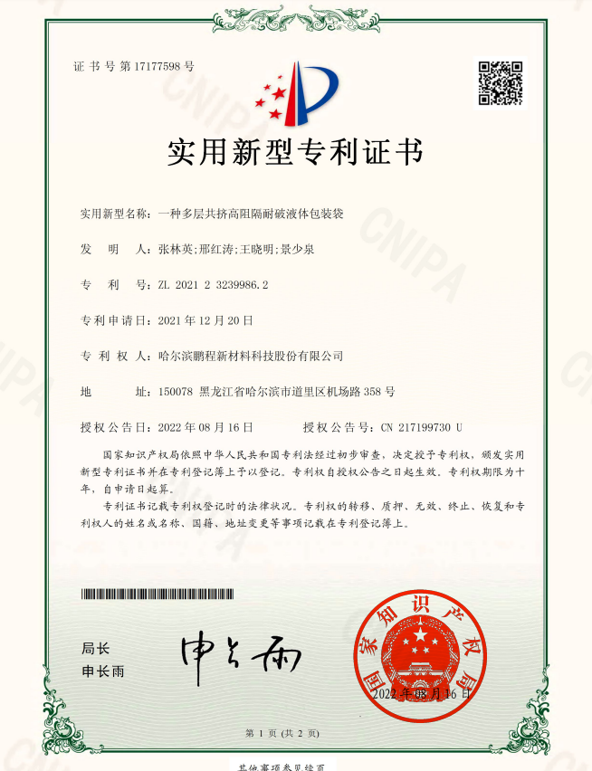一種多層共擠高阻隔耐破液體包裝袋-實用新型專利證書-證書號第17177598號