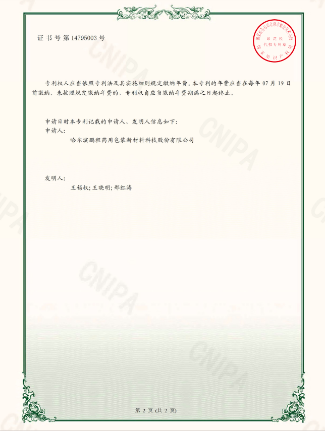 專利權人:哈爾濱鵬程藥用包裝新材料科技股份有限公司