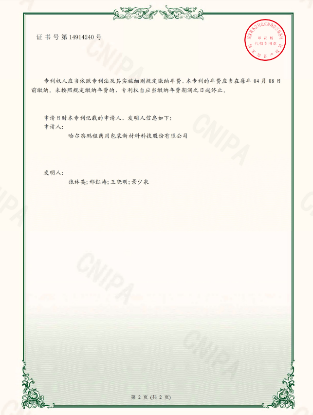 專利權(quán)人:哈爾濱鵬程藥用包裝新材料科技股份有限公司